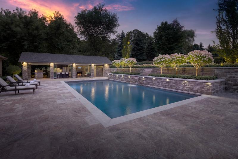 This award-winning hardscape project features an outdoor entertainment area with a covered outdoor kitchen. There is also an elegant seating area with a fireplace. Dusty Miller Landscaping’s seamless lighting design beautifully highlights the trees by the pool, which act as focal points.