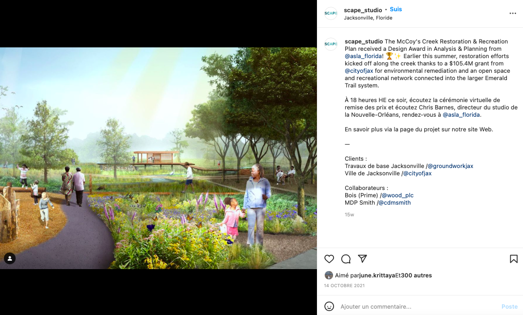 Ce projet de Jacksonville en Floride avait pour objectif de revitaliser un monument historique depuis longtemps négligé en misant sur la réintroduction de plantes indigènes, telles que le cyprès chauve et l’éclatant lilas des Indes, véritable joyau du Sud. De plus, des installations paysagères soigneusement conçues permettent d’atténuer les dommages causés par les inondations, qui sont monnaie courante dans cette région, et d’améliorer la piètre qualité de l’eau.